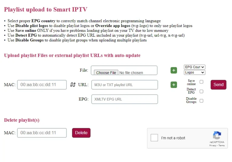 -Open the playlist uploader web page by opening this URL http://siptv.eu/mylist/. Place your TV Mac address and the M3U URL you received from us via email, mark “Keep Online” and press “Add Link”.