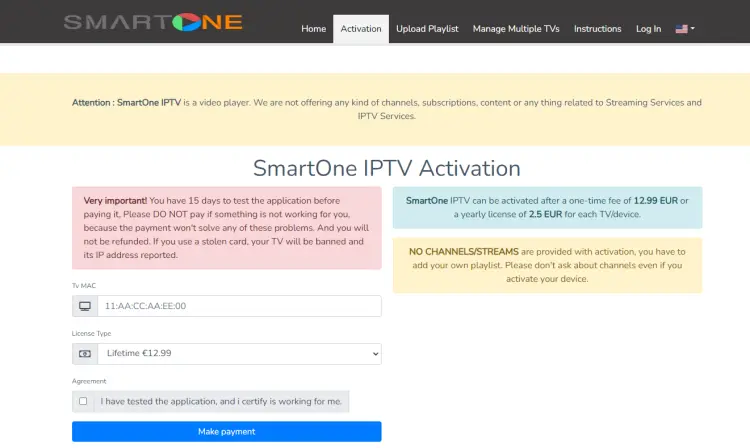 Note: SmartOne IPTV offers you a 14-day free trial. At the end of the trial, SmartOne IPTV can be Activated After a one-time fee of 12.99 EUR or a Yearly License of 2.5 EUR for each TV/device.