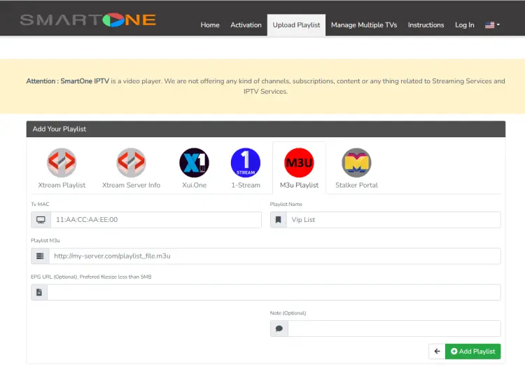 SmartOne IPTV lets you upload playlists via Xtream Codes or M3U URLs.