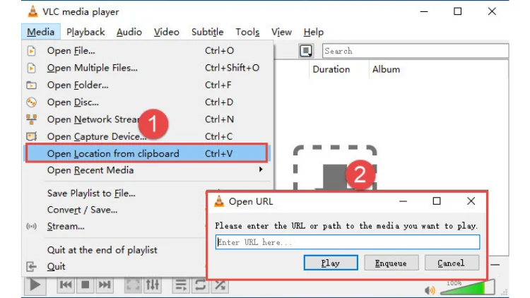Step 2: Click on “Media” in the top left corner and select Open “Location from ClipBoard“